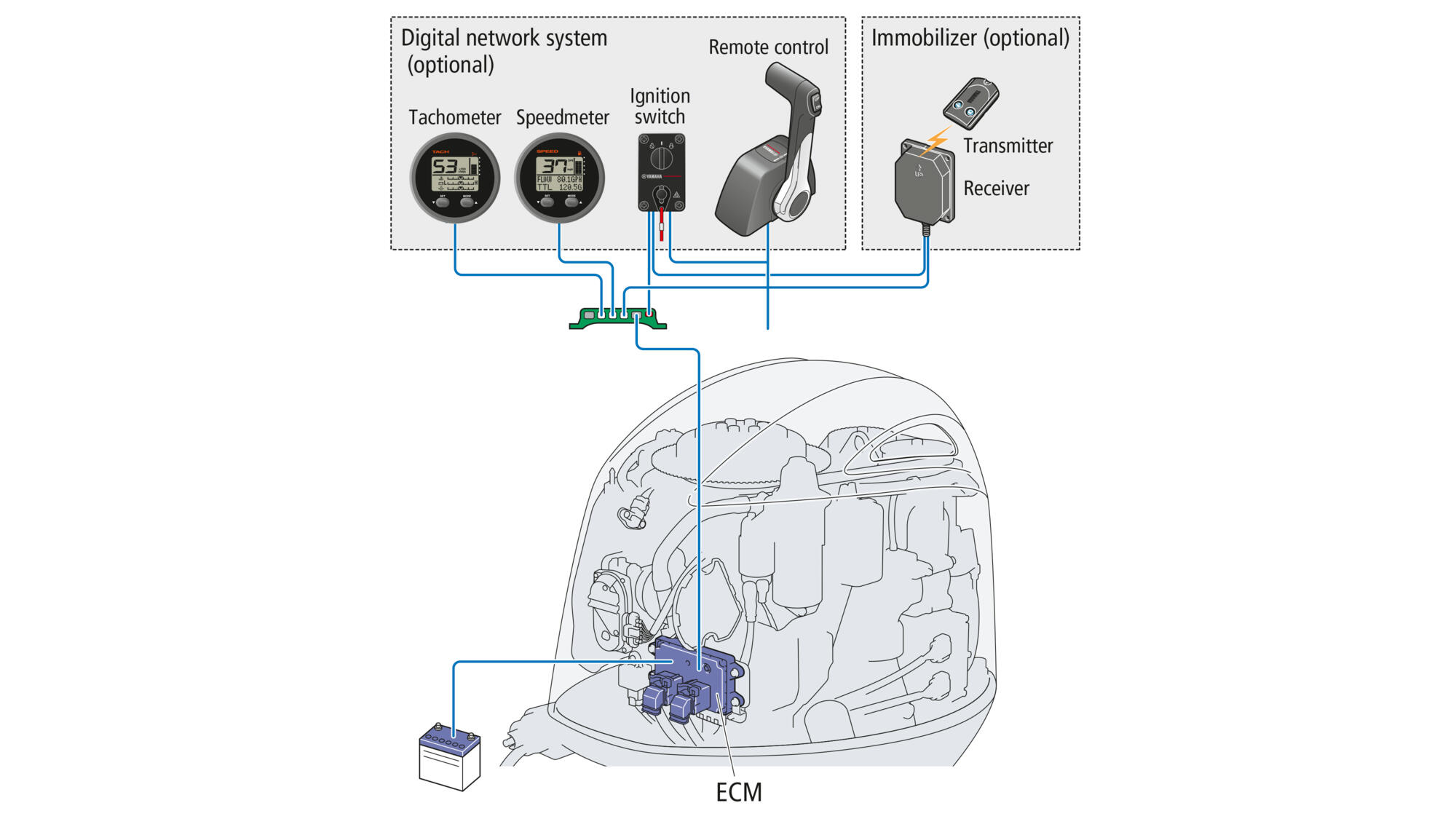 115 hj mootor sobib ideaalselt Yamaha Digital Network süsteemi ja näidikutega, maksimeerides jõudlust ja efektiivsust: mitmefunktsiooniline tahhomeeter (pöörded, töötunnid, trimmi nurk, õlirõhk, hoiatuslambid, muudetav trolling-pöörete juhtimine), ning kiirus- ja kütusemõõdik.