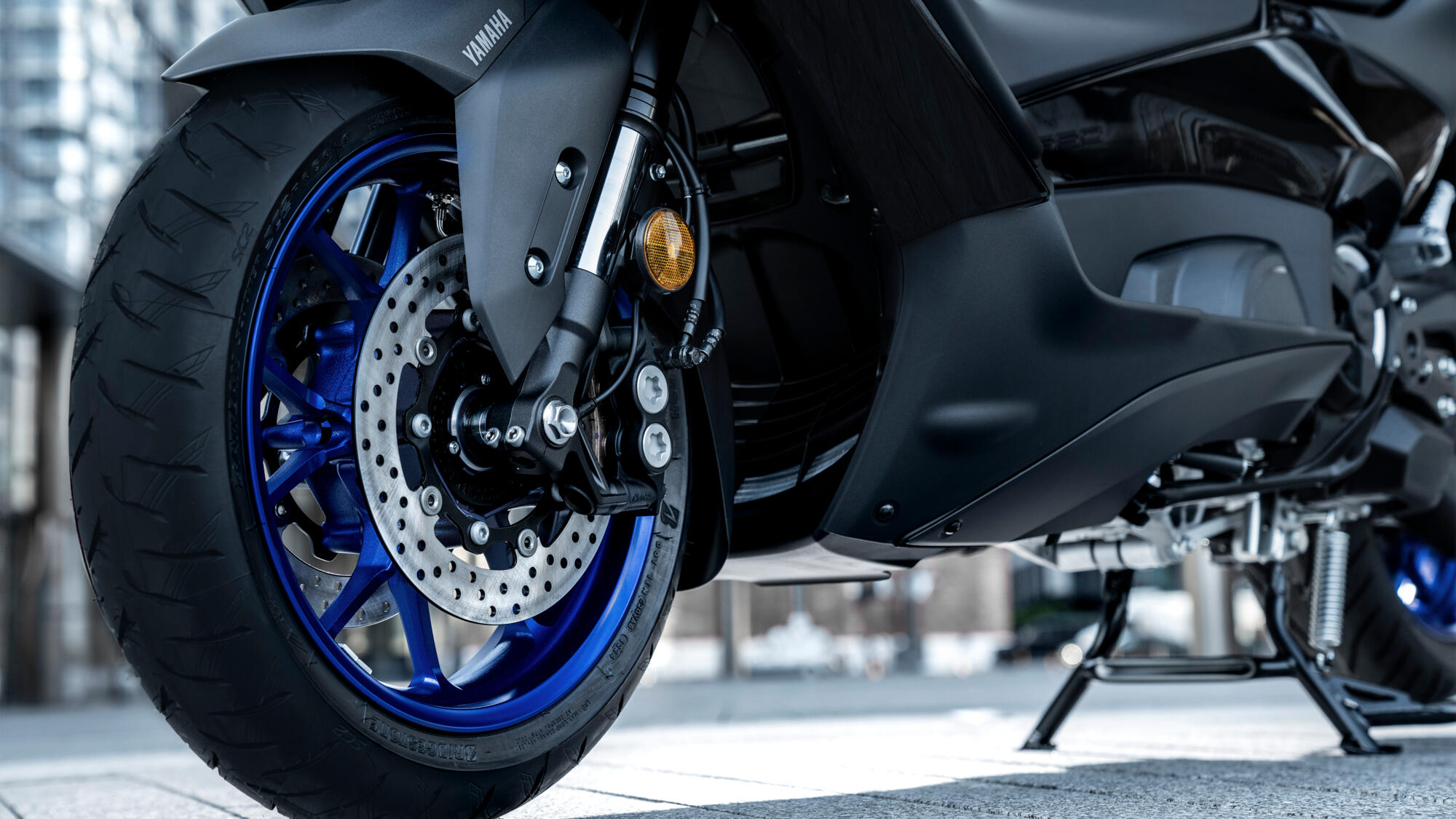 For outstanding controllability the TMAX is equipped with large diameter ABS brakes – with 267mm diameter dual front discs and a 282mm diameter rear disc. Lightweight spin forged aluminium wheels are fitted with a 120/70-15 front tyre and wide 160/60-15 rear tyre that provide high levels of traction for confident roadholding in the city and on the highway.