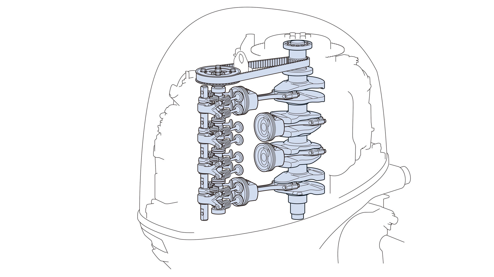 Massi vähendamiseks ja tõhususe suurendamiseks on V MAX SHO 90 hj ebatavalise sisemise disainiga – üks kõrgemal asuv nukkvõll, millel on 4 klapi silindri kohta. See seadistus tähendab väiksemat massi silindripeas ja väiksemat mootori kogumassi. Samuti aitab 4 klappi silindri kohta tagada väga tõhusa põlemise, mis omakorda suurendab võimsust, pöördemomenti ja säästlikkust.